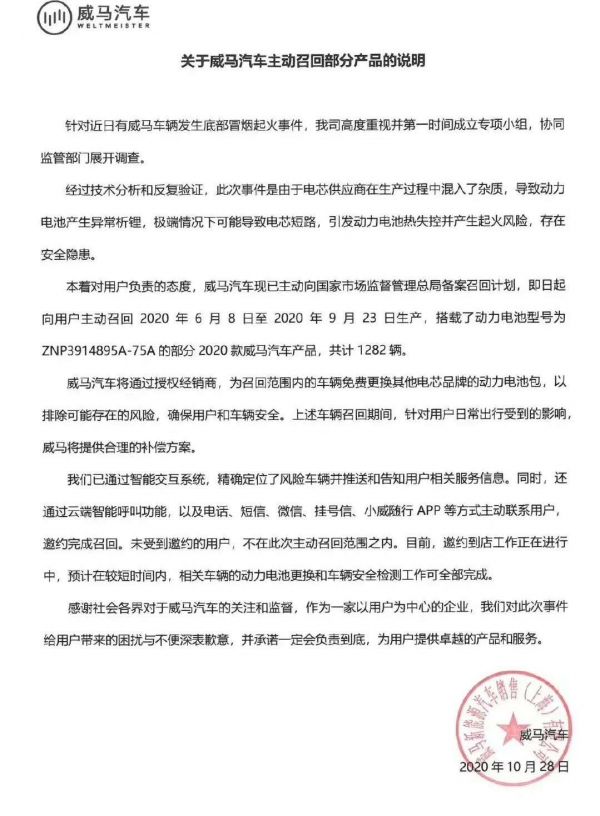 去年10月底,针对当月多次发生的车辆自燃事故,威马汽车向国家市场监督管理总局备案了一份召回计划。根据召回计划,在即日起向用户主要召回2020年6月8日至2020年9月23日生产、搭载指定型号动力电池的部分威马汽车产品,总计为1282辆。
