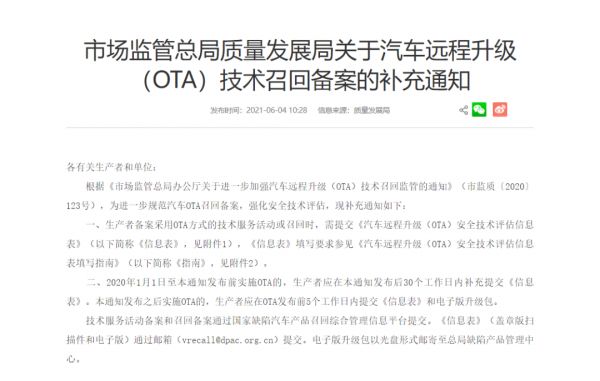 去年6月份,国家市场监管总局再次发布了《关于汽车远程升级(OTA)技术召回备案的补充通知》,对于车企进行汽车OTA备案做了进一步规范。