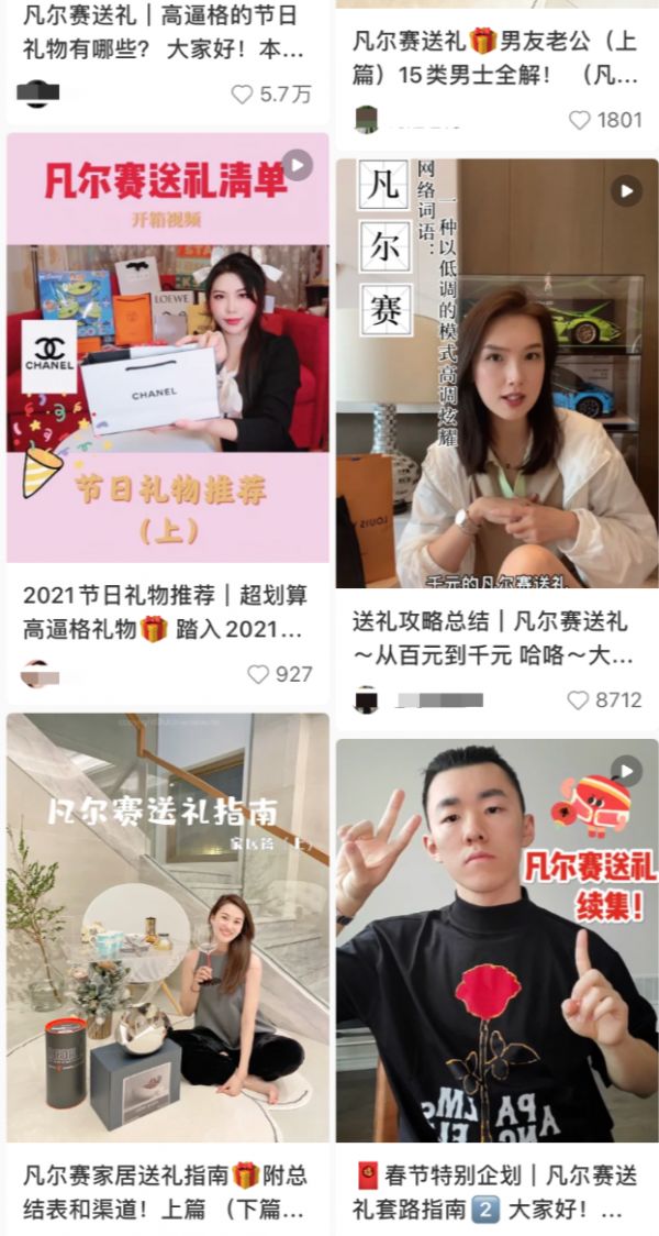 最热衷教大家送礼的是生活方式类博主。以主打生活方式分享的某博主为例,起初,他在社交账号上分享奢侈品开箱、小众品牌单品推荐等视频,始终不温不火,多数只有几百点赞。直到2020年年底,一条“凡尔赛送礼”的视频让他掌握了流量密码,点赞和收藏均破万。
