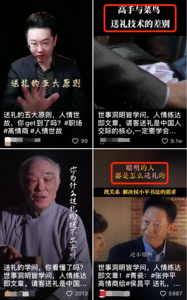 情商培训账号则常以“送礼”为案例,输出为人处世的“情商教育”,有些甚至延展到职场、官场的厚黑学,宣扬“不好好送礼,将自毁前途”。
