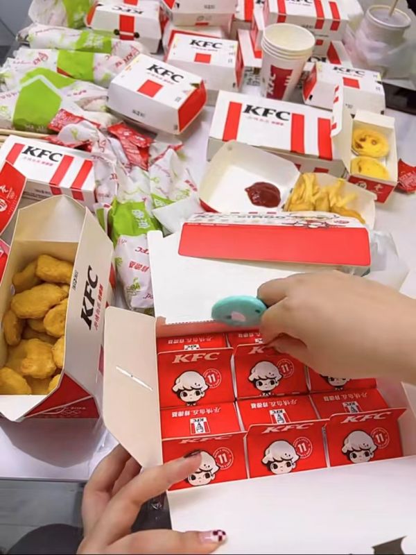 与泡泡玛特这样一个具有极高市场号召力的盲盒品牌展开合作,其受到广泛追捧的可能性是可想而知的。过量购买违背了快餐食品的消费逻辑,而盲盒本身又是一种对消费者心理的诱导,为了凑齐一套或是抽到隐藏款,短时间内重复消费成为了许多人的选择,于是,大量购买六份甚至更多套餐的人出现了。