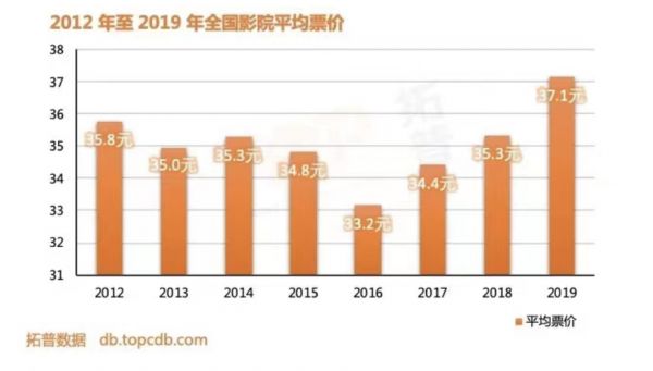 来源 / 拓普电影数据库2012年-2019年全国影院平均票价趋势图