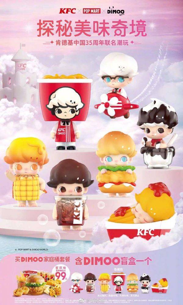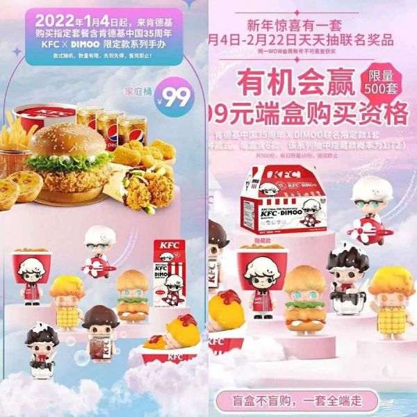据文中信息,自2022年1月4日起,消费者购买肯德基指定套餐( 99元家庭桶 )将获得肯德基中国35周年KFC X DIMOO限定款系列手办,此次的DIMOO形象均以肯德基美食为灵感打造,有冰雪圣代、晚安薯条、香甜粟米、就是可乐、汉堡饱饱和飞行上校6个常规款,以及1个隐藏款王牌炸鸡,共7款。全国总共发售263880份。