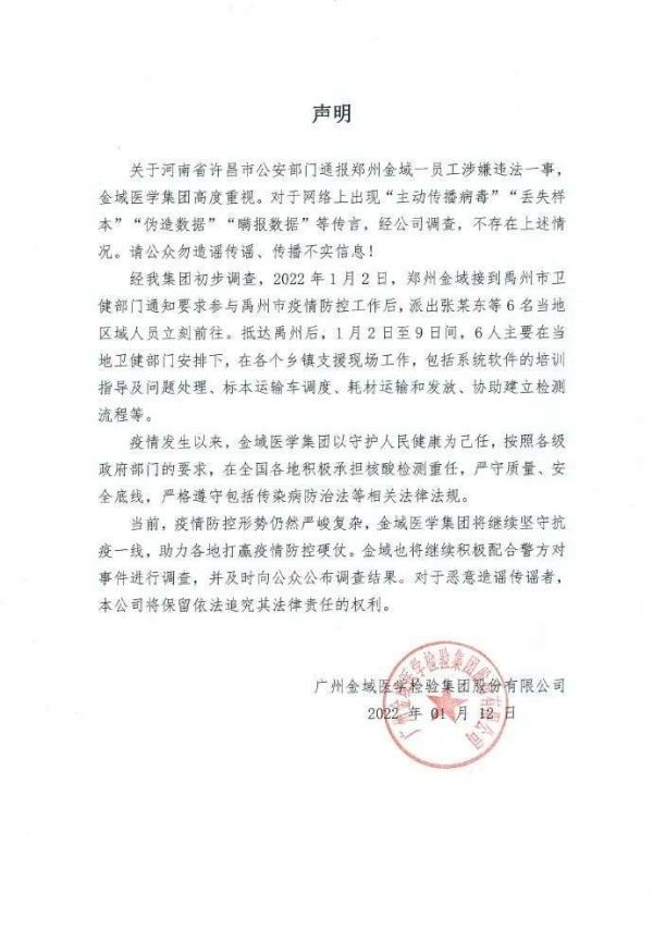 1月12日晚间,金域医学官方微博发布声明:关于河南省许昌市公安部门通报郑州金域一员工涉嫌违法一事,金域医学集团高度重视。对于网络上出现“主动传播病毒”“丢失样本”“伪造数据”“瞒报数据”等传言,经公司调查,不存在上述情况。请公众勿造谣传谣、传播不实信息!