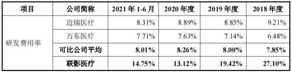 2018年至2021年上半年,联影的研发费用率分别为27.10%、19.42%、13.12%及14.75%,高于可比公司,主要系公司一贯注重技术创新和产品研发,研发投入相对更高,综合研发能力也更为强劲。