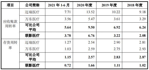 据招股书显示,2018年至2021年上半年联影医疗应收账款周转率分别为2.08次/年、3.22次/年、6.76次/年及3.78次/期,同时存货周转率分别为1.02次/年、1.11次/年、1.66次/年及0.72次/期,均较迈瑞医疗、万东医疗平均水平偏低。