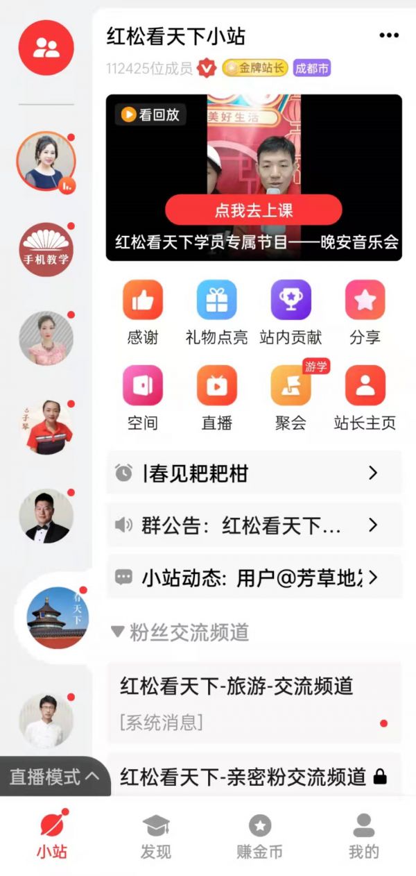 小站类似于豆瓣小组,聚集了一群同好,但互动形式更加多样,有直播、空间动态,也有不同主题的聊天群。在红松APP上,小站显示在首页,目前红松课堂已经发展出数千个垂直的小站。