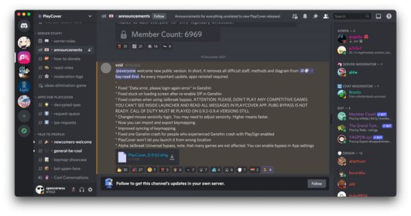 目前最新的 PlayCover 版本是 0.9.63,加入官方 Discord 之后可以看到开发者在 #announcements 频道发布的更新信息,点击附件下载安装即可。