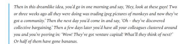 “然后在这个梦幻般的想法中,你会在某天早上去说,'嘿,看看这些家伙!'。两三周前,他们所做的只是交易猴子的jpeg图片,现在他们已经有了一个社区。然后第二天你会进来说,'哦--他们发现了集体谈判'。然后几天后,你会让你所有的同事聚集在你身边,你正在窥视。'哇!他们已经有了风险资本!'。他们接下来会想到什么?或者有一半的人已经疯了。”