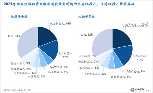 从2021年机器人领域一级市场的融资分布结果看,服务机器人遥遥领先,医疗机器人等特种机器人相对次之,工业机器人则居后,一级市场对机器人的加码侧重于没有包袱的优势部分。