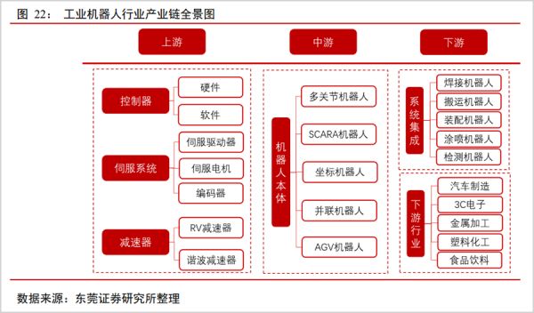 将一台工业机器人分拆开来,其组件包括上游核心零部件、中游机器人本体、下游系统集成三大部分。