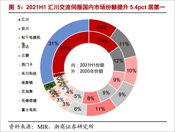 这种难点也决定了研发历史较长的外资占优势。据统计,2019年,国内伺服系统领域,以日本松下、安川以及欧系西门子、施耐德等外资企业合计占比超过52%,内资企业仅占26%左右,排名靠前的有汇川科技(10.7%)、雷赛智能(2.3%)。