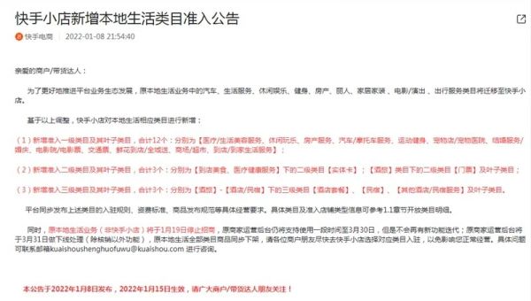 事情的缘由是,与美团联手数天后,快手电商原本地生活业务中的生活服务、休闲娱乐、电影/演出出行服务类目将迁移至快手小店,酒店/民宿属于快手小店新增准入的三级类目。