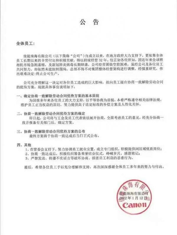 一份盖有佳能珠海有限公司公章的公告显示,因近年来全球照相机市场急剧萎缩,及新冠肺炎病毒长期肆虐,公司面临空前困难。 虽经公司及各位员工共同努力,依然未能扭转困局,总部经慎重研究,做出艰难决定,终止公司生产。