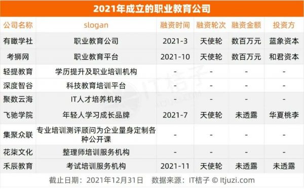 除此之外,在 2021 年成立的新经济公司中也有职业教育公司的身影。IT 桔子发现 2021 年新成立的公司中有 9 家是职业教育培训公司,它们有的是面向企业可量身定制各种公开课,有的面向职场人士提供各种职业培训,有的甚至则根据社会发展提供新技能课程,例如整理师培训服务。而这 9 家公司中,飞驰学院创始人李尚龙曾是新东方老师,后来参与创办考虫网,其飞驰学院在 2021 年 7 月份获得天使轮投资;原三节课联合创始人黄有璨创办了「有瞰学社」,获得了蓝象资本的投资。