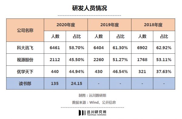 作为智能教育设备的供应商,读书郎2020年研发开支仅为3021万元,占全部营收的4.1%,平摊到135名研发人员头上,人均成本约22.4万元,显著低于同行水平。最新的招股书显示截止2021年5月31日,研发人员仅有123人,比前一年还要少10多人。