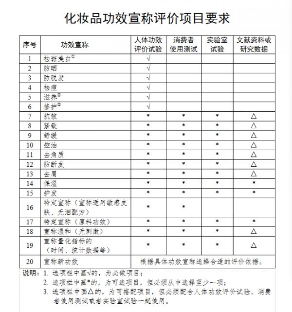 《化妆品功效宣称评价规范》明确指出,祛斑美白、防晒、防脱发、祛痘、修护、滋养等6类功效,只能通过人体功效评价试验方式进行功效宣称评价;其他功效可在人体功效评价试验、消费者使用测试、实验室试验等方法中任选其一,保湿和特定宣称(原料功效)则还可以选择文献资料或研究数据的评价方式。