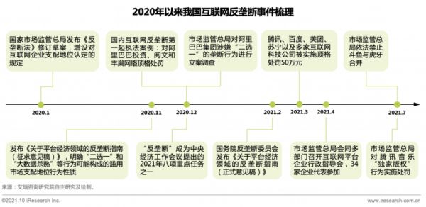 而从外部影响因素来看,由消费领域互联网平台带来的垄断、不正当竞争等问题开始受到监管部门关注。2020 年 11 月,市场监管总局发布《关于平台经济领域的反垄断指南(征求意见稿)》,12 月即打响了反垄断处罚第一枪。2021年,互联网公司涉及的违反《反垄断法》的案件多达86起。