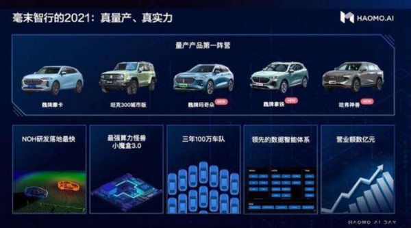 在长城汽车的全力支持下,毫末智行的辅助驾驶解决方案已经陆续搭载在魏牌摩卡、坦克300城市版、魏牌拿铁、魏牌玛奇朵、哈弗神兽等车型上,辅助驾驶用户行驶里程突破400万公里。预计到2022年底,毫末辅助驾驶系统将搭载至34款长城乘用车型,未来三年搭载乘用车数量预计超过100万台。对于自动驾驶技术公司来说,无论是搭载量还是实际行驶的里程,都是衡量其估值的重要指标。以目前长城汽车在国内的发展势头和规模体量来看,要想实现搭载数量超过100万台其实轻而易举。而在如此庞大的基数上,毫末智行要想积累足够的道路场景数据也没有任何难度。