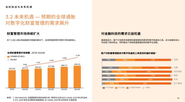 据安永的一份报告显示,全球超过一半的客户对财富管理服务中数字和虚拟工具表达了接纳态度,其中新兴市场的欢迎程度更是瞩目。其原因大致来源于三个方面。