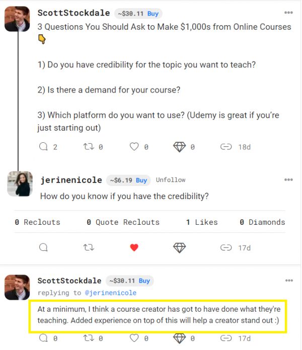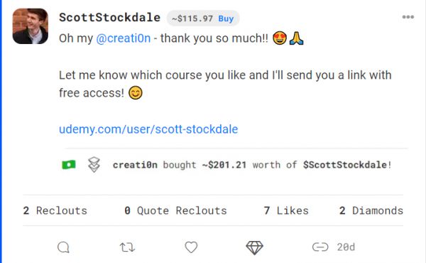 另一个例子是在 BitClout 上。如果用户购买了我的硬币,我会向他们发送一个链接,该链接可以免费访问我的一门课程。