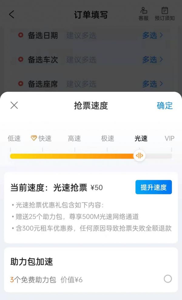 而除了邀请好友获得加速包之外,用户还可以付费购买一定数量的加速包。以携程为例,其将抢票速度分为低速、快速、高速、极速、光速、VIP多个档位,从低速升级到快速需要付费10元,宣称可以专享20M快速网络通道;高速抢票需要30元,享受50M抢票专属服务器;极速为40元,为100M网络通道;光速则为50元,为500M网络通道。购买光速抢票后,邀请好友助力则可升至VIP抢票。