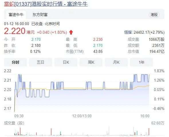 据数据显示,截至2022年01月12日收盘,雷蛇报2.22港元/股,市值为194.47亿港元。