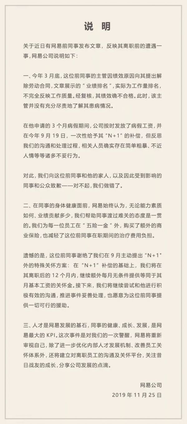 2019年11月24日,网易游戏员工李某在个人微信公众号 “你的游戏我的心‘发布了一篇文章,很快《网易裁员,让保安把身患绝症的我赶出公司。我在网易亲身经历的噩梦!》就刷遍全网。