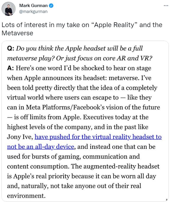 原话是这么说的:“如果在苹果发布AR头盔的时候听到元宇宙这个词,我会很震惊。我被明确告知,一个完全虚拟的世界,用户可以逃到那里--就像他们在Meta Platforms/Facebook的未来愿景中那样--而这样的想法是苹果的禁区。”