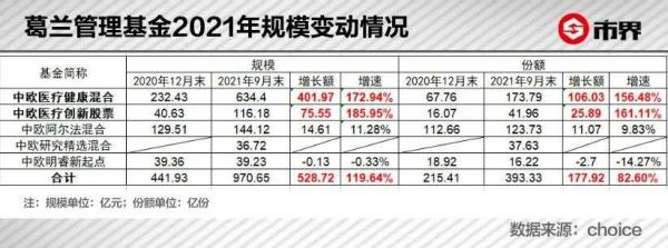 截至2021年三季度末,葛兰的在管基金规模为970.02亿元。其中中欧医疗健康的份额从年初的67.76亿份增长至173.79亿份。中欧医疗创新的份额从年初的16.07亿份增长至41.96亿份。两只基金的份额规模分别增长156%、161%。