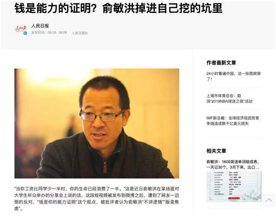 随即,俞敏洪的这番言论就遭到了人民日报的痛批:“对于金钱的过度鄙视与极端追捧,都是一种病态。在绝大多数时候,钱只是对一个人努力工作付出的回报,它只是构成一个人生命的一小部分。除了钱之外,一个人的家庭、健康、事业甚至虚拟一些的理想等等,都是生命的重要组成部分。”