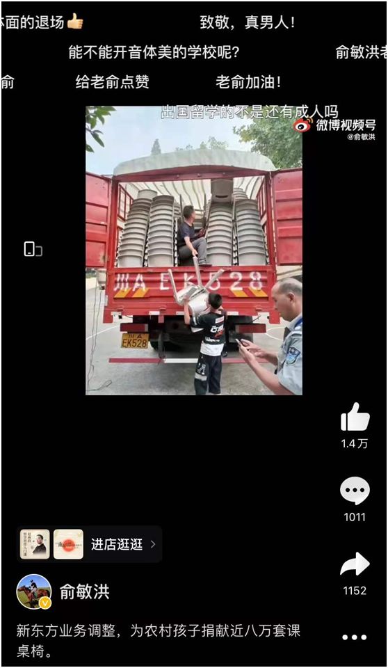 他开始做一些公益活动,比如,给山区的孩子捐了8万套崭新课桌,博得了不少网友的赞许:“良心企业家,真男人,真体面人。”