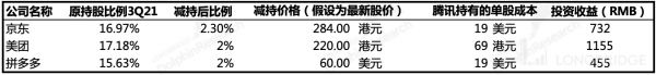 c. 投资收益结果。按照上面确定的抛售价和最新持有成本,京东、美团、拼多多被减持后的投资收益如下(假设腾讯对美团、拼多多的持股比例减持到 2%)