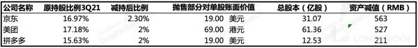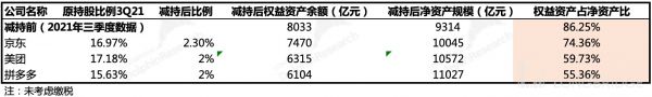 结合<1-2>,海豚君在按照 2021 年三季报披露的资产数据,算下来如果依次减持京东、美团、拼多多后,对应的权益资产占净资产比重分别为:
