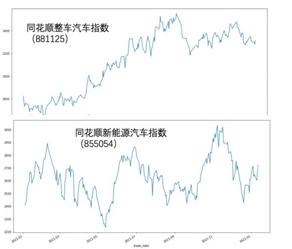 我们首先抓取了同花顺整车和新能源两大汽车指数进行对比,见下图