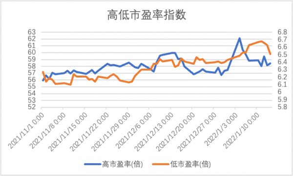 可以较为明显看到,进入2021年12月之后,两大指数平均市盈率差值不断在缩小,在年末低市盈率指数平均市盈率超过了高市盈率。