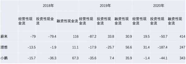 于是我们又整理了新势力厂商的现金流情况(单位均为“亿元”),见下图