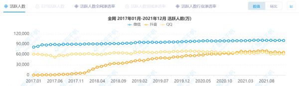 图 / 2017-2021年微信、QQ 和抖音全网月活人数对比 来源 / 易观千帆