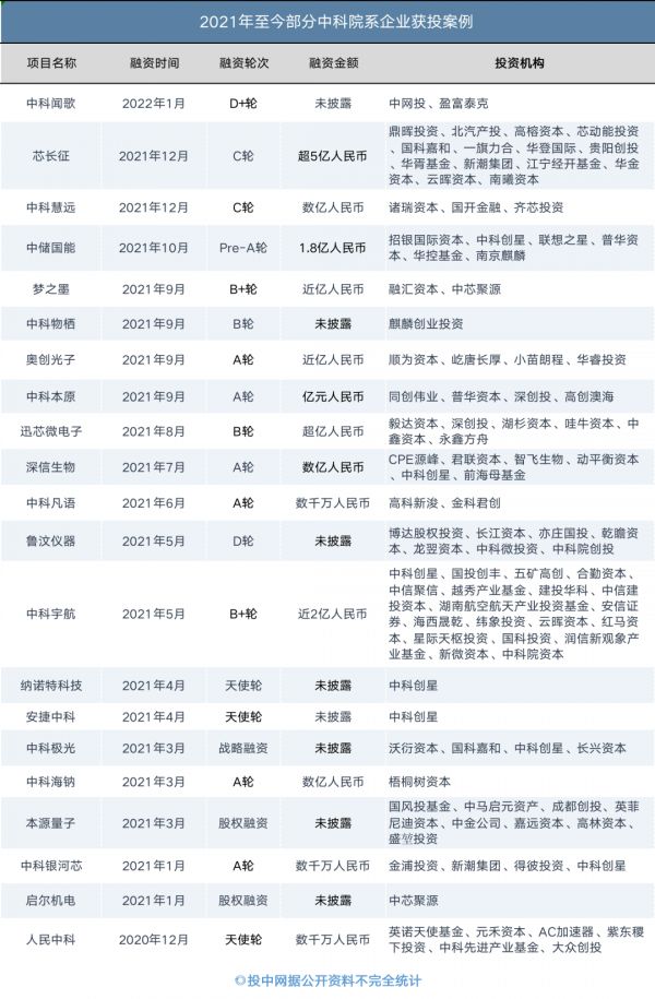 也因此,中科院不断涌现出科研人员创业的消息,例如中科院计算所研究员及博士生导师陈天石创办寒武纪已成功上市,再比如随手一搜就能看到的中科慧远、中科驭数、中科微澜、中科微电子、中科新进、中科本原、中科昊芯、中科原动力、中科玖源等,都获得了不少融资额。