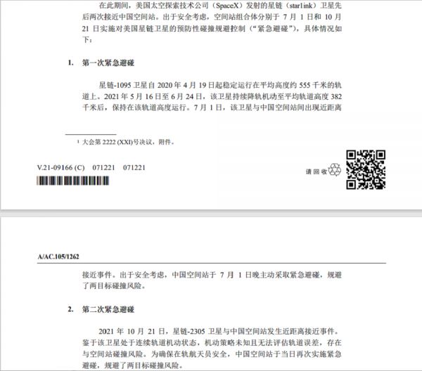 2021年12月28日,在当日例行记者会上,外交部发言人赵立坚证实,2021年7月和10月,美国星链卫星先后两次接近中国空间站,在此期间,中国航天员正在空间站内执行任务,出于安全考虑,中国空间站采取了紧急避碰措施。