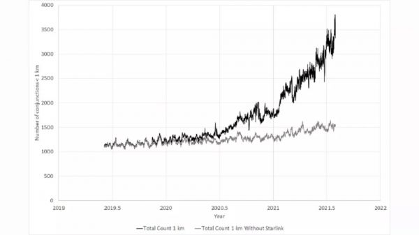 英国南安普顿大学宇航研究小组负责人休·刘易斯(Hugh Lewis)称,如果按两个航天器在彼此相距0.6英里(1公里)的距离内经过的情况算作两个航天器有近距离接触存在碰撞危险的标准来算,全部星链卫星每周就有约1600次这样的情况出现,已占据了全部此类时间的50%,可以说对很容易威胁到其他航天器的安全。