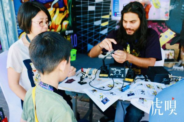 Village更强调动手能力,比如有的家长带着小朋友来参加,在极客村工作人员的指导下焊接小蜜蜂,还有的人按照示意图自己拼接智能硬件,又比如现场有一位外国老大爷坐在那儿玩了一两个小时的中国榫卯。