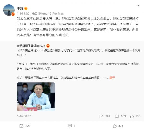 李想就是其中之一。尽管团车网官宣进入造车领域时,还曾在微博@蔚来、理想、小鹏,但李想的回复可谓是一点不留情面。