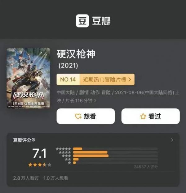 但如若从口碑层面和未来潜力层面来看,这一年算得上是网络电影的沉淀求变之年。市场上不仅诞生了豆瓣开分8.3分、当前7.1分的《硬汉枪神》,整体质量也有所突破,豆瓣评分6.0分以上者增多,行业在精品化道路上不断前行。可以确信的是,未来将会有更多的高分网络电影诞生。