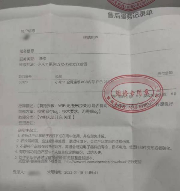 “这些我都能忍受,但后来WiFi又坏了,不能上网,这还咋用?”王先生表示,10月中旬,手机无法连接WiFi,后被官方送检,在联系客户并被送检之后,小米官方确定为手机质量问题导致WiFi损坏,手机被换新。