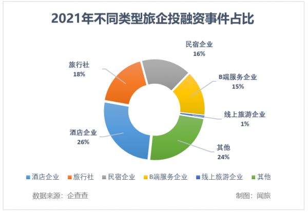 通过统计数据可以看到,2021年酒店领域相关企业融资事件有32起,占比26%;民宿领域相关融资事件有20起,占比16%;旅行社企业相关融资事件有22起,占比约18%;线上旅游平台相关融资事件有8起,占比约1%;B端服务企业有18起,占比约15%。