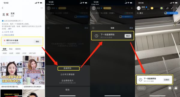 推送直播预告前需提前在视频号创建好预告信息。直播开始后,点击“链接”,选择添加“直播预告”,即可生成直播预告链接。主播点击“推送”即可将直播预约发送至直播界面底部。 用户点击“预约”按钮,即可提前锁定下一场直播。