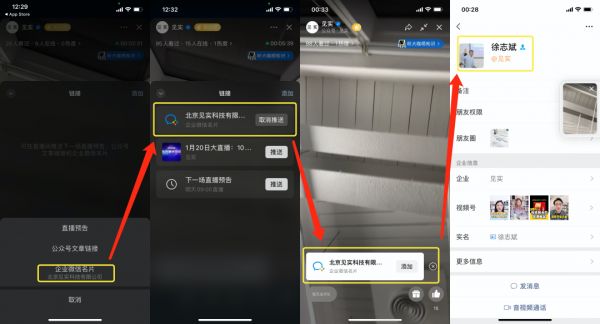 已完成企业认证的视频号主,可在直播间推送视频号所绑定的企业微信成员名片。直播开始后,点击“链接”,选择添加“企业微信名片”,主播点击“推送”即可将企微名片发送至直播界面底部。这里需要注意的是, 用户点击“添加”时,将从所设置的多个企业微信成员中随机分配一个。