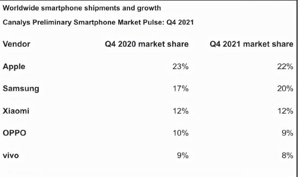 而在中国市场上,OPPO、vivo分别以21.7%和19.3%的市场份额位居第一、第二,苹果、小米、荣耀等紧随其后。