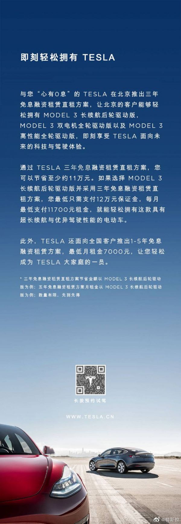 @微博【特斯拉:为北京客户推出三年免息融资购车与免费车牌租赁服务】6月4日晚间,特斯拉通过官方微博表示,为北京客户推出三年免息融资购车与免费车牌租赁服务。通过Tesla融资租赁方案购买Model 3长续航版本与高性能版本,至少能为顾客节约11万元。